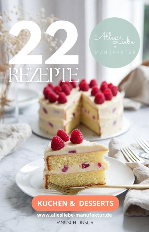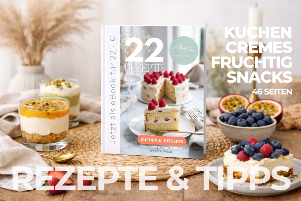 Liebe Backfreunde, ich bin Danusch von der Alles Liebe Manufaktur und habe für euch ein liebevoll zusammengestelltes eBook mit Kuchen, Cremes, fruchtigen Desserts & kleinen Snacks erstellt.